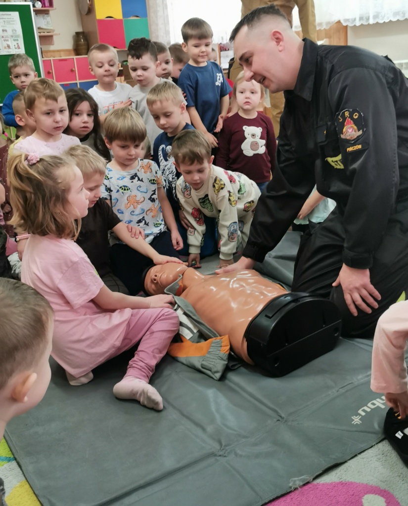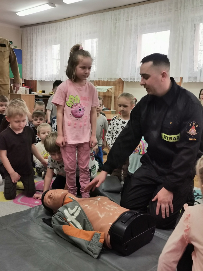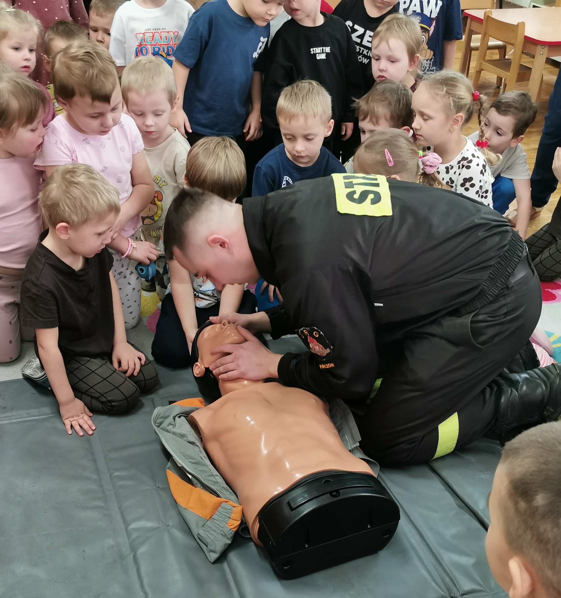 Strażacy zaprezentowali fantom, na którym dzieci mogły zobaczyć, jak wygląda udzielanie pomocy, a na zakończenie odbyły się praktyczne ćwiczenia, w których przedszkolaki chętnie uczestniczyły